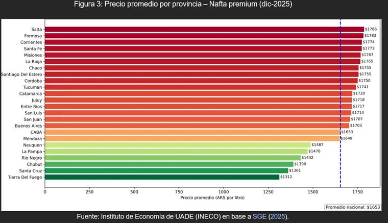 A nivel territorial, el estudio expone marcadas diferencias entre provincias. Mientras que la Ciudad de Buenos Aires se mantiene en línea con el promedio nacional, distritos patagónicos como Tierra del Fuego, Santa Cruz y Chubut registran los precios más bajos, en parte por una menor carga impositiva.