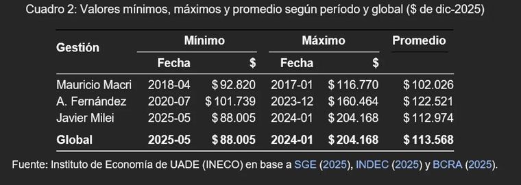 De acuerdo al relevamiento, durante la actual administración el costo promedio ronda los $112.974, un nivel inferior al registrado en la gestión de Alberto Fernández y considerado uno de los más bajos de los últimos años en términos reales. El valor máximo del período se observó al inicio del gobierno de Javier Milei, mientras que el mínimo se alcanzó en mayo de 2025.