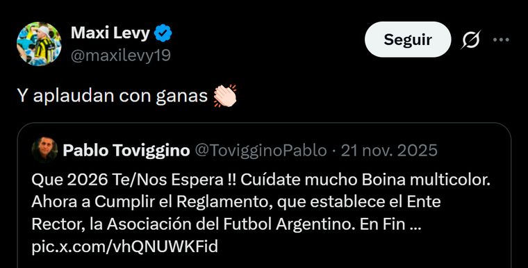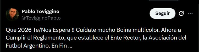 Uno de los tantos posteos que había esgrimido Toviggino y al que parodió el ídolo del Pincha fue uno que había hecho en X previo al duelo de Estudiantes contra Central en Arroyito y los obligaba a realizar el pasillo: "¡Que 2026 te/nos espera! ¡Cuidate mucho, boina multicolor. Ahora a cumplir el reglamento que establece el ente rector, la Asociación del Futbol Argentino. En fin …", había expresado, amenazante.