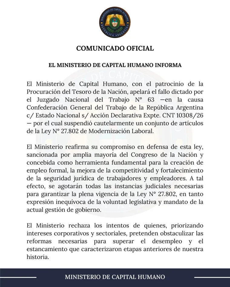El Ministerio de Capital Humano emitió un comunicado oficial confirmando que no se quedará de brazos cruzados ante el reciente revés judicial. Con el respaldo de la Procuración del Tesoro, el Gobierno apelará la medida cautelar que suspendió artículos clave de la ley de reforma laboral, marcando un nuevo capítulo en la tensa relación entre el Gobierno y la CGT.