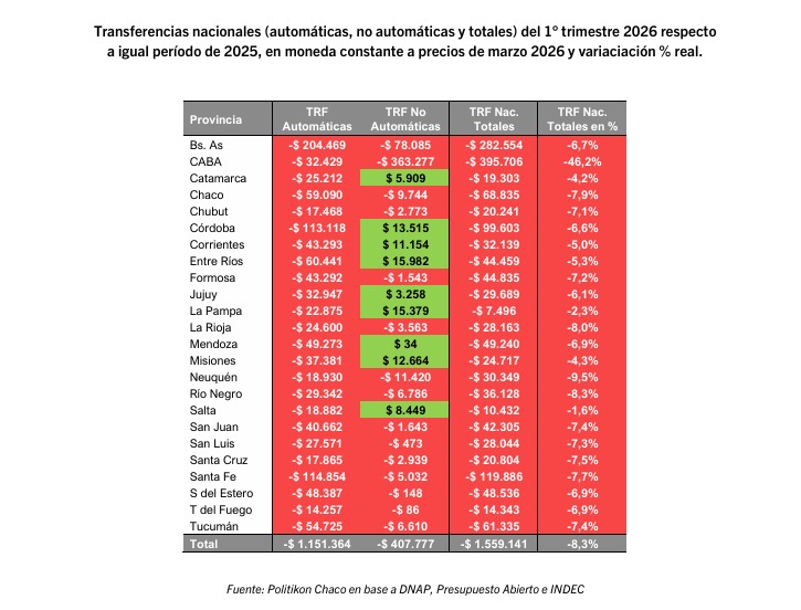 Los números que explican la crisis fiscal de La Rioja tienen ahora una radiografía precisa. Un informe de la consultora Politikon Chaco, elaborado en base a datos de la Dirección Nacional de Asuntos Provinciales (DNAP), Presupuesto Abierto e INDEC, revela que la provincia recibió durante el primer trimestre de 2026 un total de 28.163 millones de pesos menos en transferencias nacionales que en igual período del año anterior, medidos en moneda constante a precios de marzo de 2026. La caída real fue del 8,0%, una de las más pronunciadas entre las 24 jurisdicciones del país.