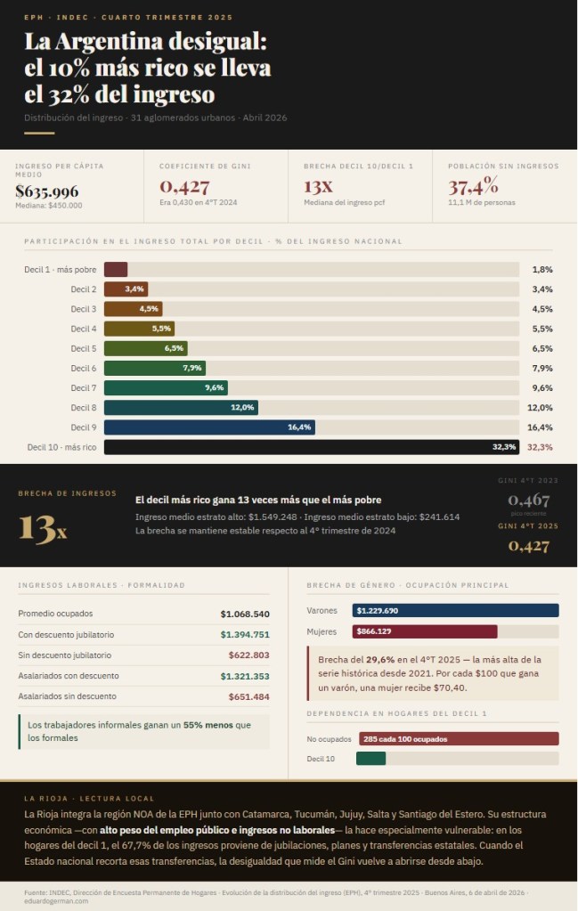 La fotografía de la desigualdad argentina en el cierre de 2025 tiene números concretos. El INDEC publicó esta semana el informe de Evolución de la Distribución del Ingreso correspondiente al cuarto trimestre de 2025, basado en la Encuesta Permanente de Hogares (EPH) que releva 31 aglomerados urbanos del país —entre ellos, La Rioja capital—. El resultado es un retrato descarnado de una sociedad que creció nominalmente pero no logró distribuir esa riqueza de manera equitativa.