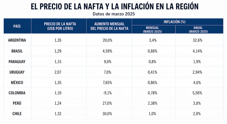 En Uruguay, en tanto, el precio del combustible ya era el más alto de la región y continuó en ese lugar, pero con un aumento en el mes de marzo de del 7%. Así pasó a costar US$ 2,07 por litro la versión de 95 octanos. La inflación interanual alcanzó el 2,94%, con una variación mensual del 0,41%.