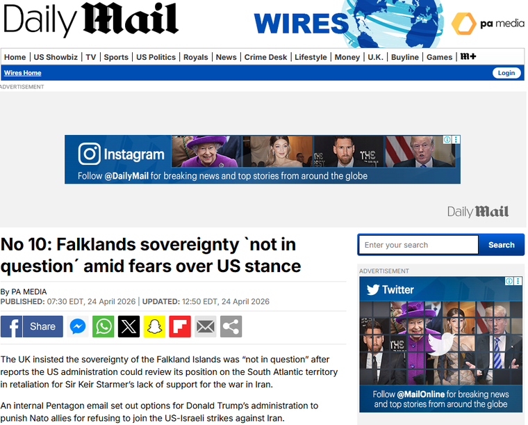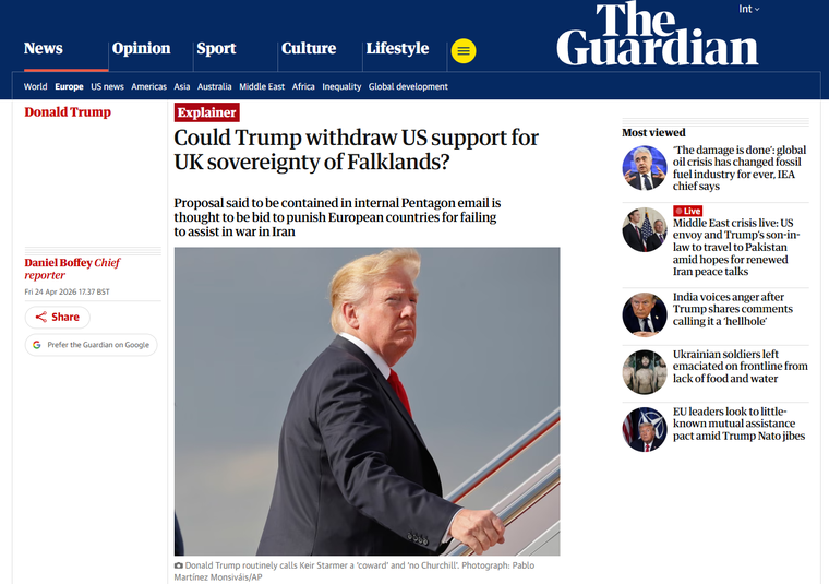 En tanto, The Guardian contextualizó la información dentro del escenario internacional y destacó que el correo interno del Pentágono plantea un conjunto de medidas de presión. El diario recordó la disputa entre el Reino Unido y Argentina por la soberanía del archipiélago, así como el antecedente del conflicto armado de 1982, que dejó 650 soldados argentinos y 255 británicos muertos.
