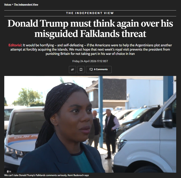 The Independent analizó el impacto político de la situación y señaló la tensión entre Trump y el primer ministro británico Keir Starmer. Según el periódico, la propuesta de revisar la postura sobre las islas aparece como una respuesta a la decisión del gobierno británico de no intervenir en el conflicto con Irán.