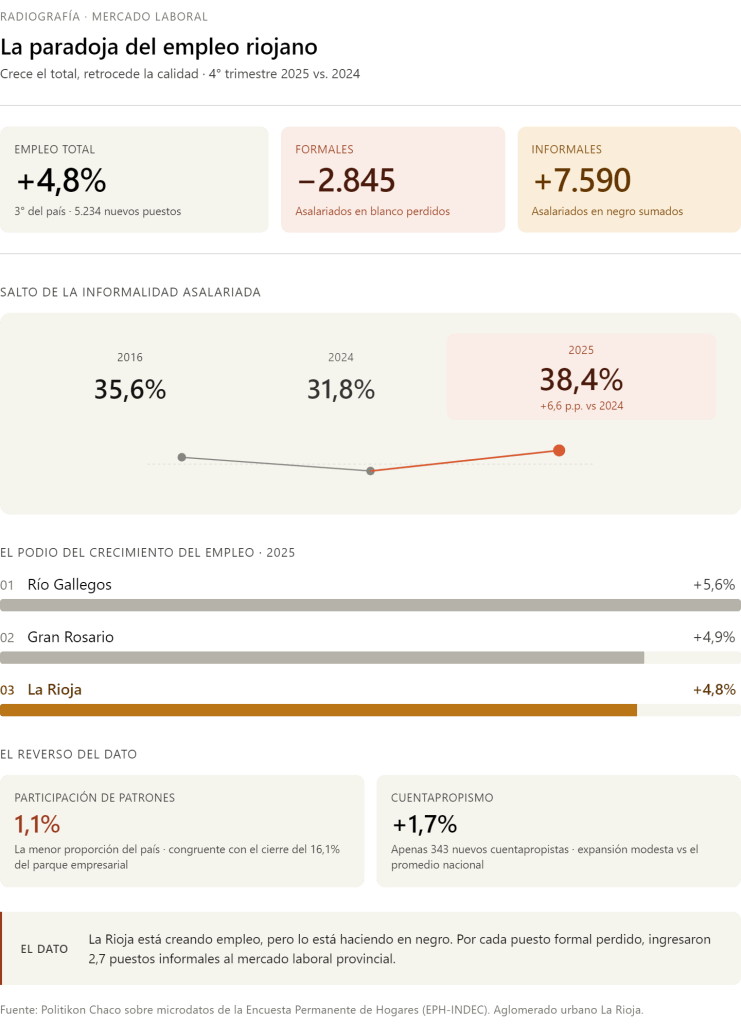 ...Sin embargo, la lectura fina del dato exhibe una paradoja preocupante: la creación de puestos se sostiene en asalariados informales (+27,5%) mientras los empleos en blanco retroceden y la tasa de informalidad asalariada riojana fue la que más subió en todo el país en términos interanuales.