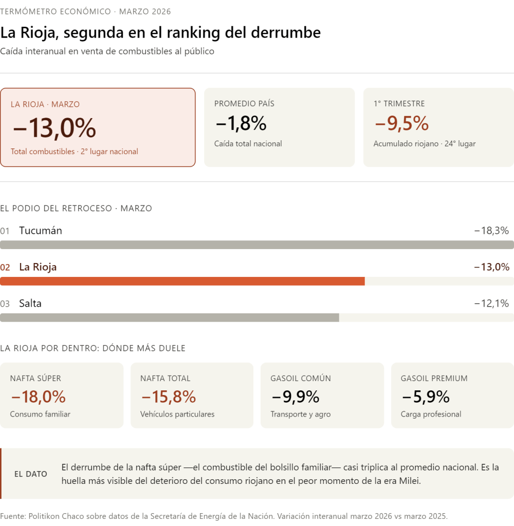 La Rioja se ubicó como la segunda provincia argentina con mayor caída en la venta de combustibles al público durante marzo de 2026, con un retroceso interanual del 13% que solo fue superado por el desplome de Tucumán (-18,3%). El dato surge de un informe de la consultora Politikon Chaco elaborado sobre estadísticas de la Secretaría de Energía de la Nación y configura uno de los indicadores económicos más negativos de los registrados por la provincia gobernada por Ricardo Quintela en el último año.