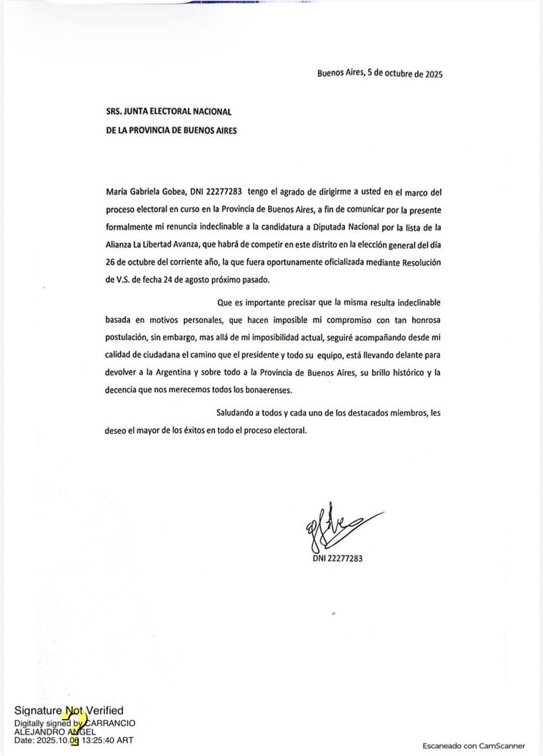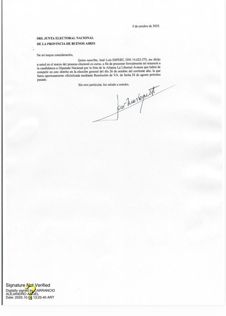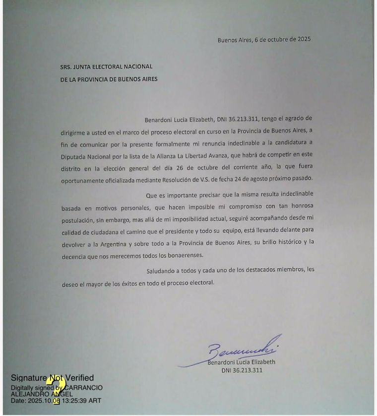 La presentación de los apoderados libertarios se realizó de manera electrónica, e incluyo las presentaciones oficiales de las renuncias a las candidaturas por la lista de La Libertad Avanza en la provincia de Buenos Aires de los candidatos José Luis Espert, Lucia Elizabeth Bernardni y María Gabriela Gobea; la ratificación partidaria de las tres renuncias y el pedido de autorización al Juez Federal de La Plata con Competencia Electoral Alejo Ramos Padilla de la reimpresión de boletas electorales (a usarse en los comicios nacionales del 26 de octubre) y el corrimiento en la lista de los candidatos de La Libertad Avanza en la provincia de Buenos Aires.