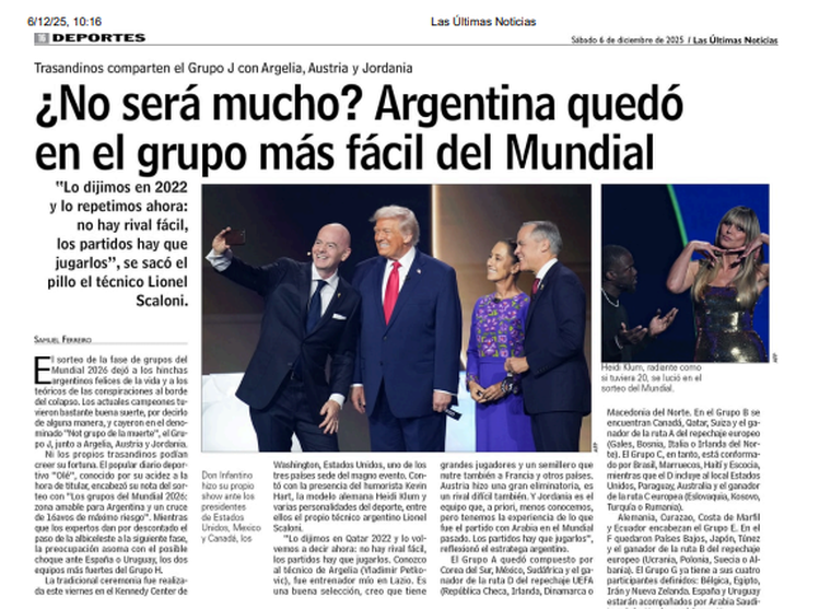 La forma en que plantea la noticia da a entender que ni en Argentina se podía creer la "fortuna". De hecho, citan al popular diario deportivo Olé, que tituló: "Los grupos del Mundial 2026: zona amable para Argentina y un cruce de 16avos de máximo riesgo".