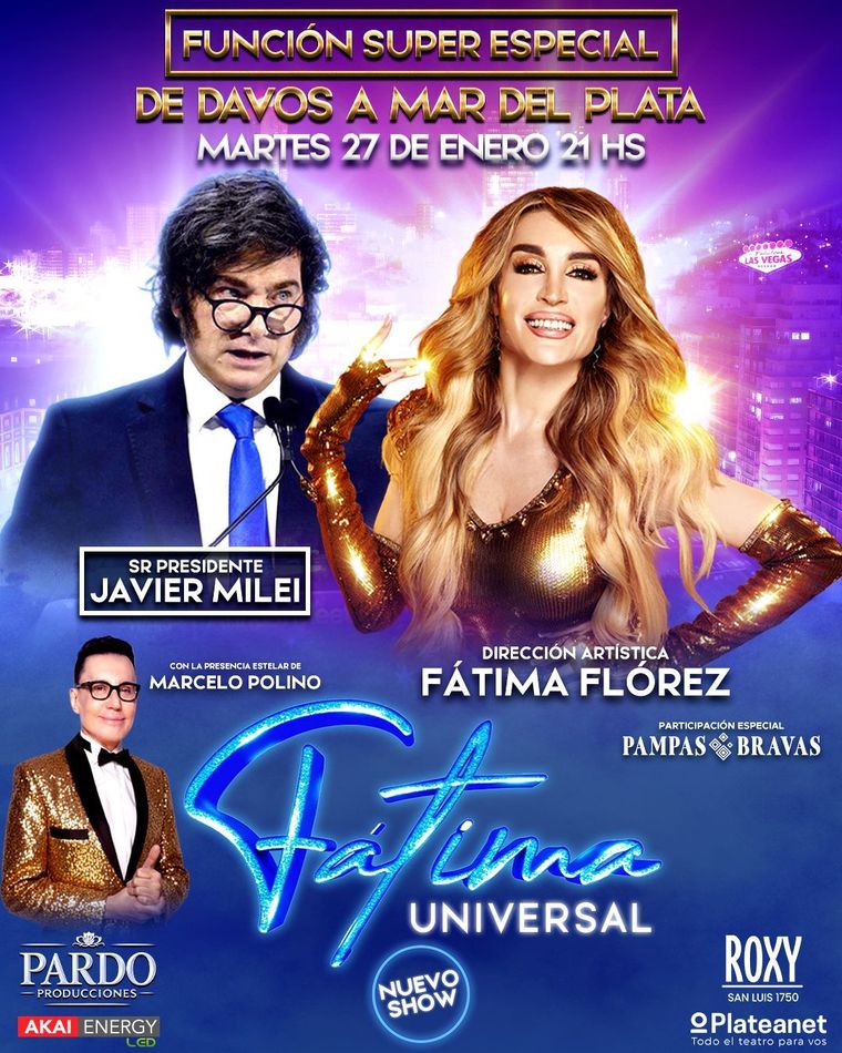 La actriz Fátima Florez sorprendió este viernes al anunciar que el presidente Javier Milei asistirá a una función especial del espectáculo “Fátima Universal”, el próximo martes 27 de enero a las 21, en el Teatro Roxy de Mar del Plata donde la artista se encuentra haciendo temporada.