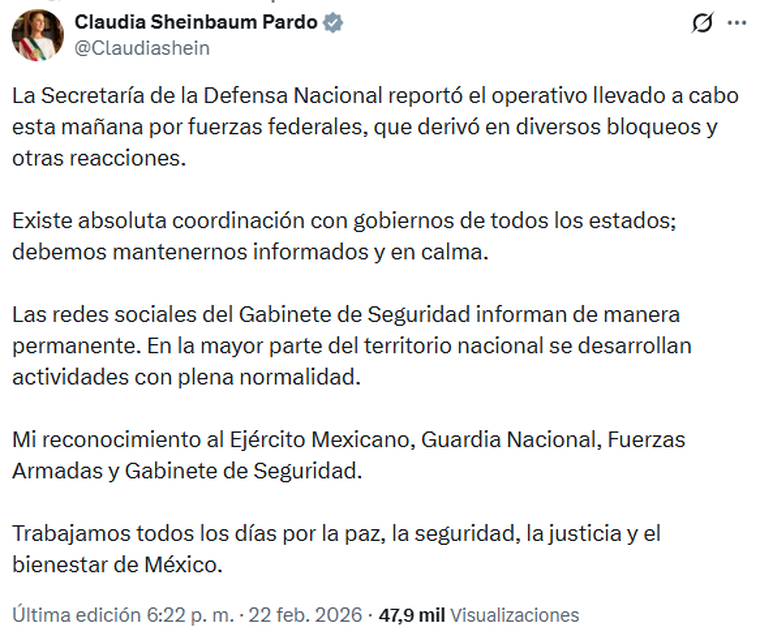 La presidenta de México, Claudia Sheinbaum, llamó este domingo a la población a mantenerse "en calma", tras el abatimiento de Nemesio Rubén Oseguera Cervantes, alias El Mencho, líder del Cártel Jalisco Nueva Generación (CJNG), que derivó en diversos bloqueos de carreteras y otras reacciones violentas.