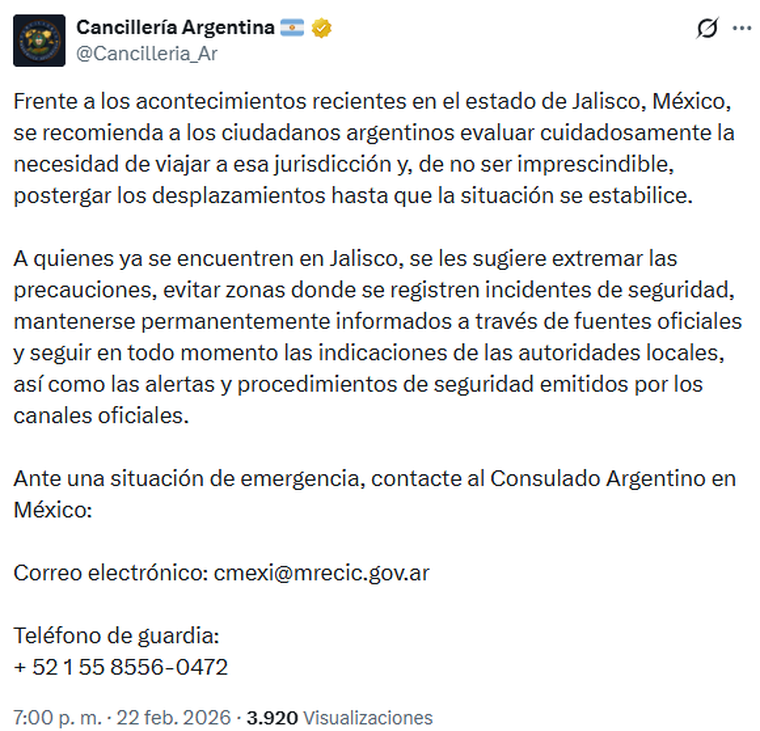 En el comunicado difundido por redes sociales, la cartera liderada por Pablo Quirno recomendó "evaluar cuidadosamente la necesidad de viajar a Jalisco y, de no ser imprescindible, postergar los desplazamientos hasta que la situación se estabilice".