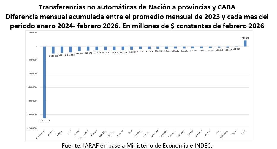 Sin embargo, la dimensión política del ajuste no puede ser soslayada. El Gobierno Nacional priorizó trasferencias discrecionales hacia la Ciudad Autónoma de Buenos Aires, que registró un incremento acumulado de $876.000 millones entre enero 2024 y febrero 2026, justificado por una medida cautelar de la Suprema Corte que obligó a elevar la coparticipación bonaerense del 1,4% al 2,95%. Mientras CABA ganaba, las veintidós jurisdicciones restantes perdían. La Rioja, gobernada por Ricardo Quintela desde una plataforma provincial de resistencia fiscal denominada «Federales Somos Todos», experimentó una reducción que pone en jaque la viabilidad de servicios provinciales ya fragilizados.