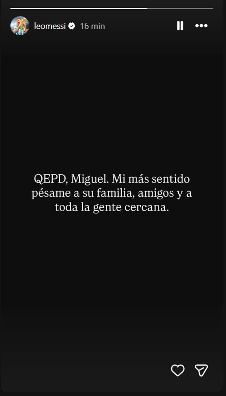 "QEPD, Miguel. Mi más sentido pésame a su familia, amigos y a toda la gente cercana", escribió la Pulga en las historias de su cuenta de Instagram, en un breve pero sincero texto de parte de alguien que nunca lo tuvo como DT o siquiera lo enfrentó, pero no podía no escribirle unas últimas palabras.