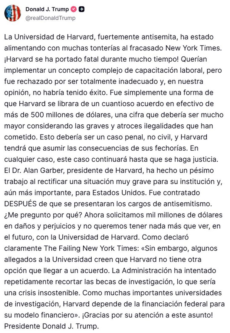 “Ahora estamos buscando 1.000 millones de dólares en daños y perjuicios, y no queremos tener nada más que ver con la Universidad de Harvard”, escribió Trump en su red Truth Social. El mensaje llegó después de que el Times informara que el gobierno había desistido de exigirle 200 millones de dólares a la universidad para cerrar la disputa.